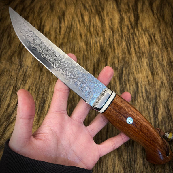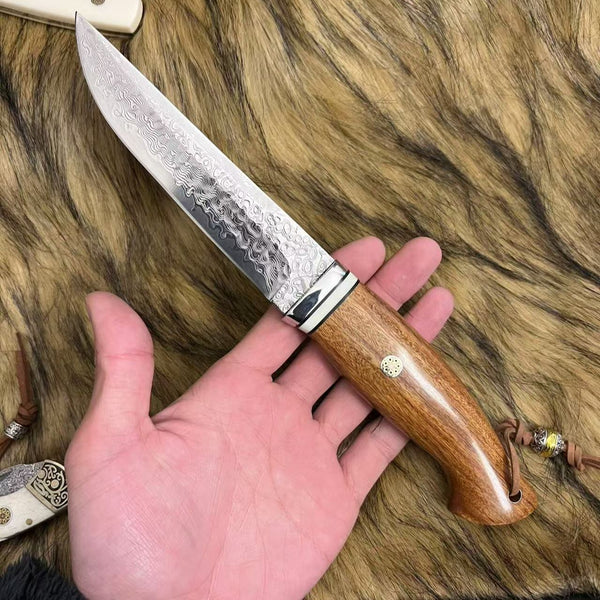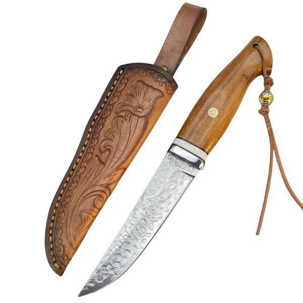This Damascus-style portable camping knife is built for outdoor reliability and strength.